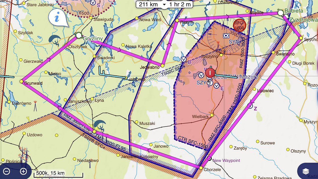 Ważne! – trasa obejmuje przelot pod TMA EPSY i bliskiej odległości od CTR EPSY oraz EPP12 (zakazana 24h GND – 1500 ft)