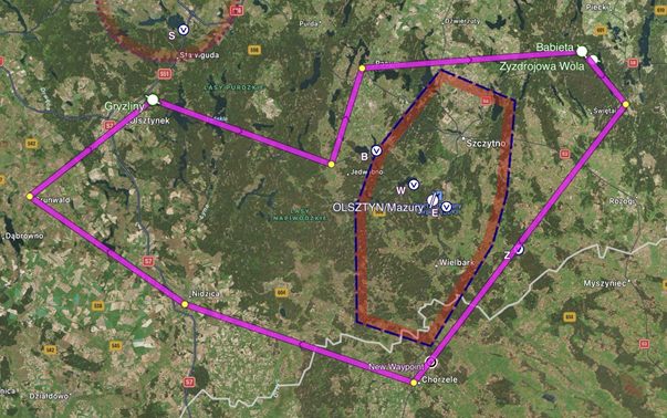 Start Gryźliny EPGR (119,705 MHz) – Jedwabno – Pasym – Babięta EPBB – Spychowo – Chorzele -Ruciane Nida – Nidzice - Grunwald - Lądowanie Gryźliny EPGR (119,705 MHz)
